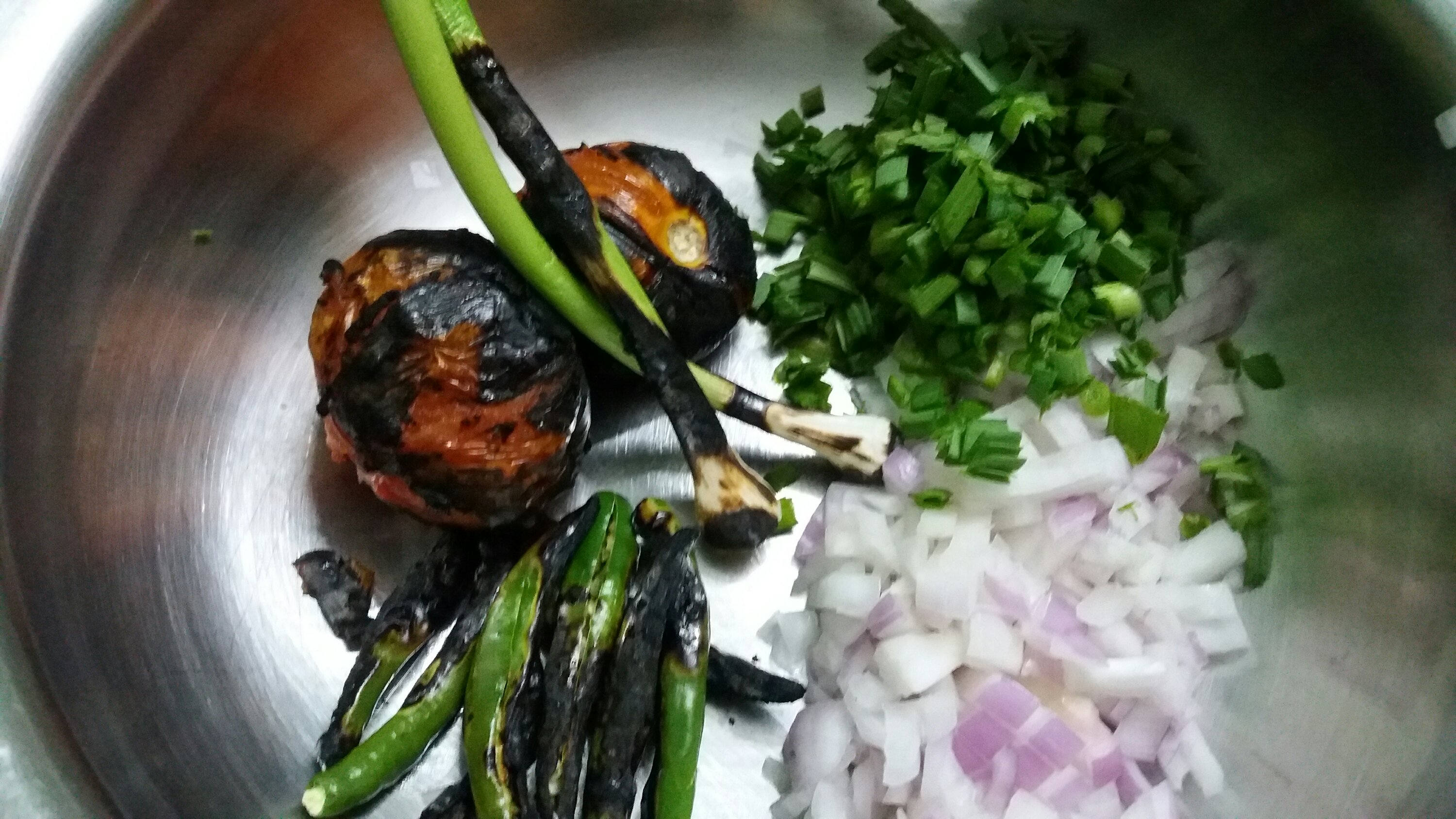 in a big bowl,take mashed eggplant,garlic,tomatoes,potatoes,green chili,onions,spring onions(green)coriander leaves,mustard oil and salt