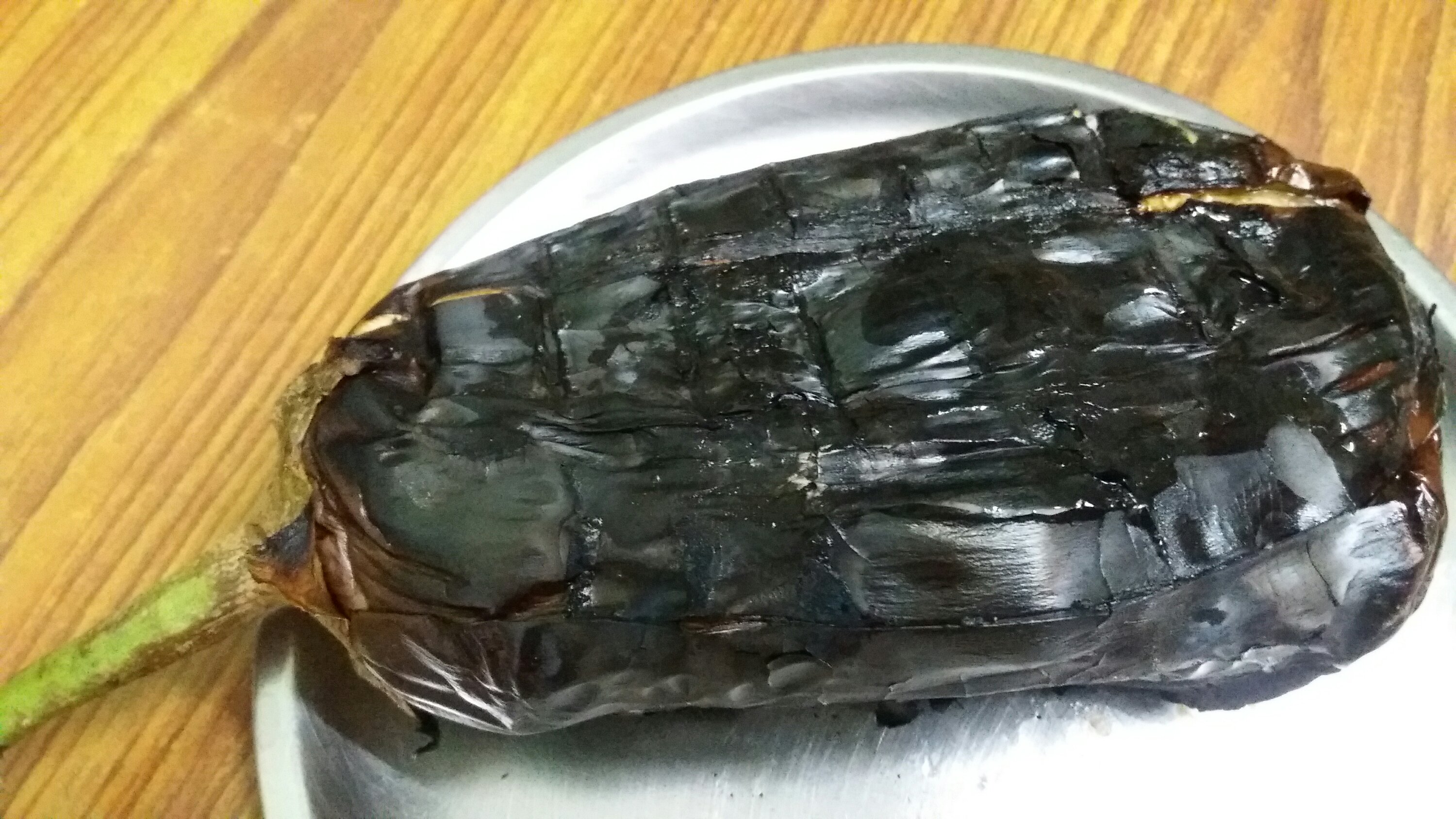 Apply some oil on the eggplant,make slits on the eggplant 3 to 4,now stuff the garlics in the split and roast it on a wire rack or net on open flame,keep turning it so that baigan cooks from all sides well.