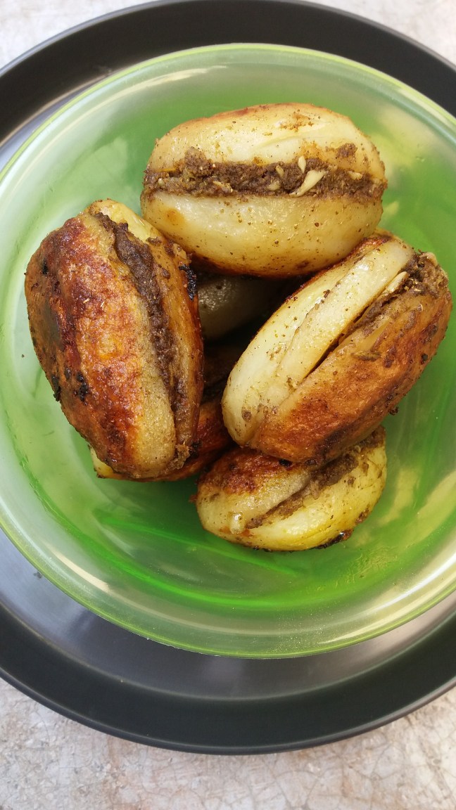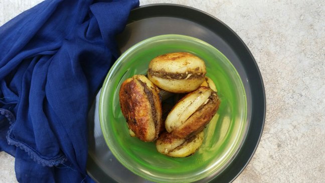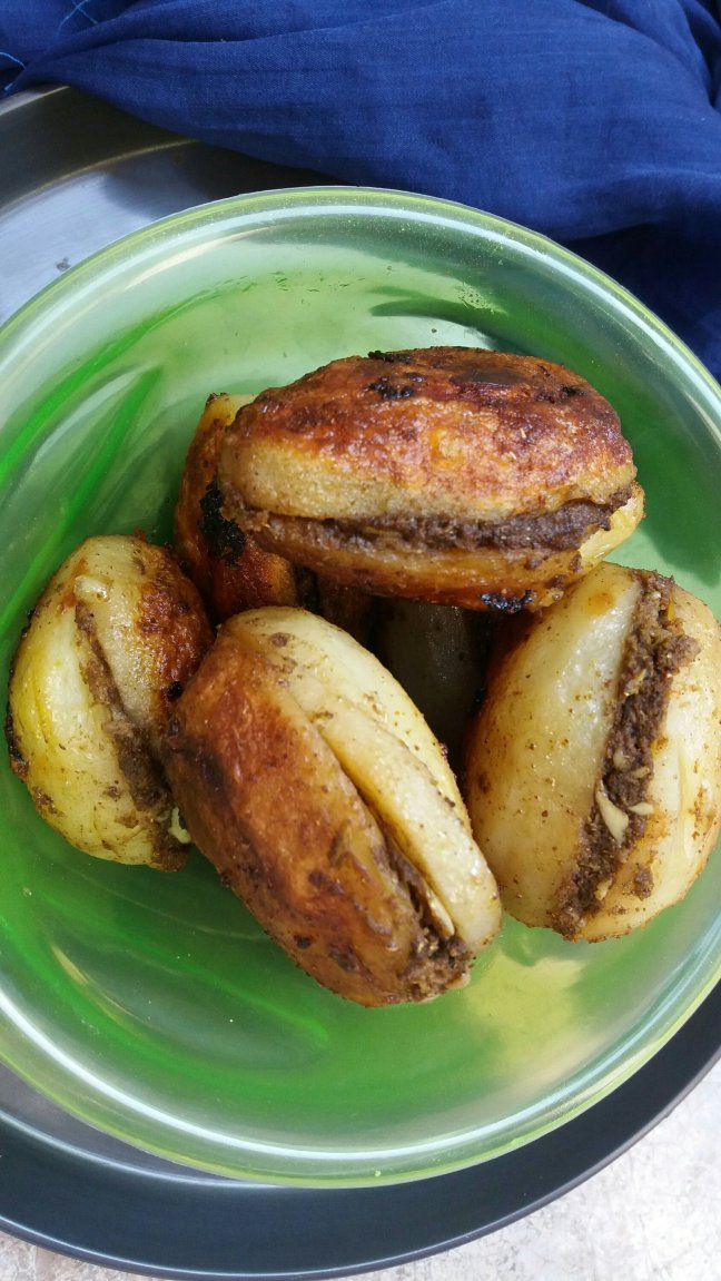 Aloo or potatoes are one vegetable loved by all and has so many variations. I remember when as kids we would travel by train to Banaras it would take 24 hours or more to reach depending on the trains, n those days travelling by AC coach was for only rich class people and middle class would not even think of travelling in them,so keeping your food from getting spoil was a task and our ancestors knew very well how to keep food fresh.Potatoes are the ones that don’t get spoiled quickly, if cooked dry.Here’s a recipe Aloo ki kalauji a simple and crunchy one to enjoy any time. Any vegetable stuffed is called kalauji.So lets get the recipe