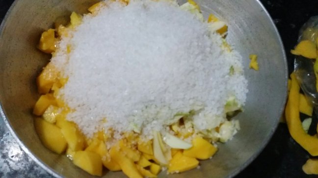 • Take a kadhai add in chopped mangoes 3 cups water and sugar
