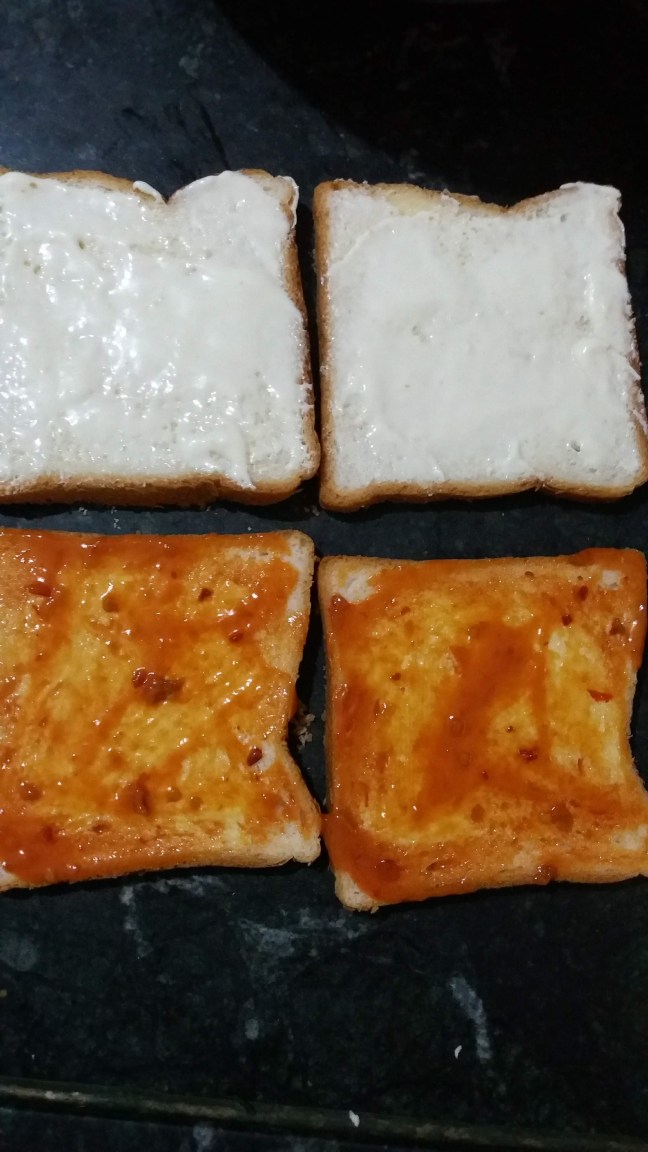 - Apply mayonnaise and butter on one slice