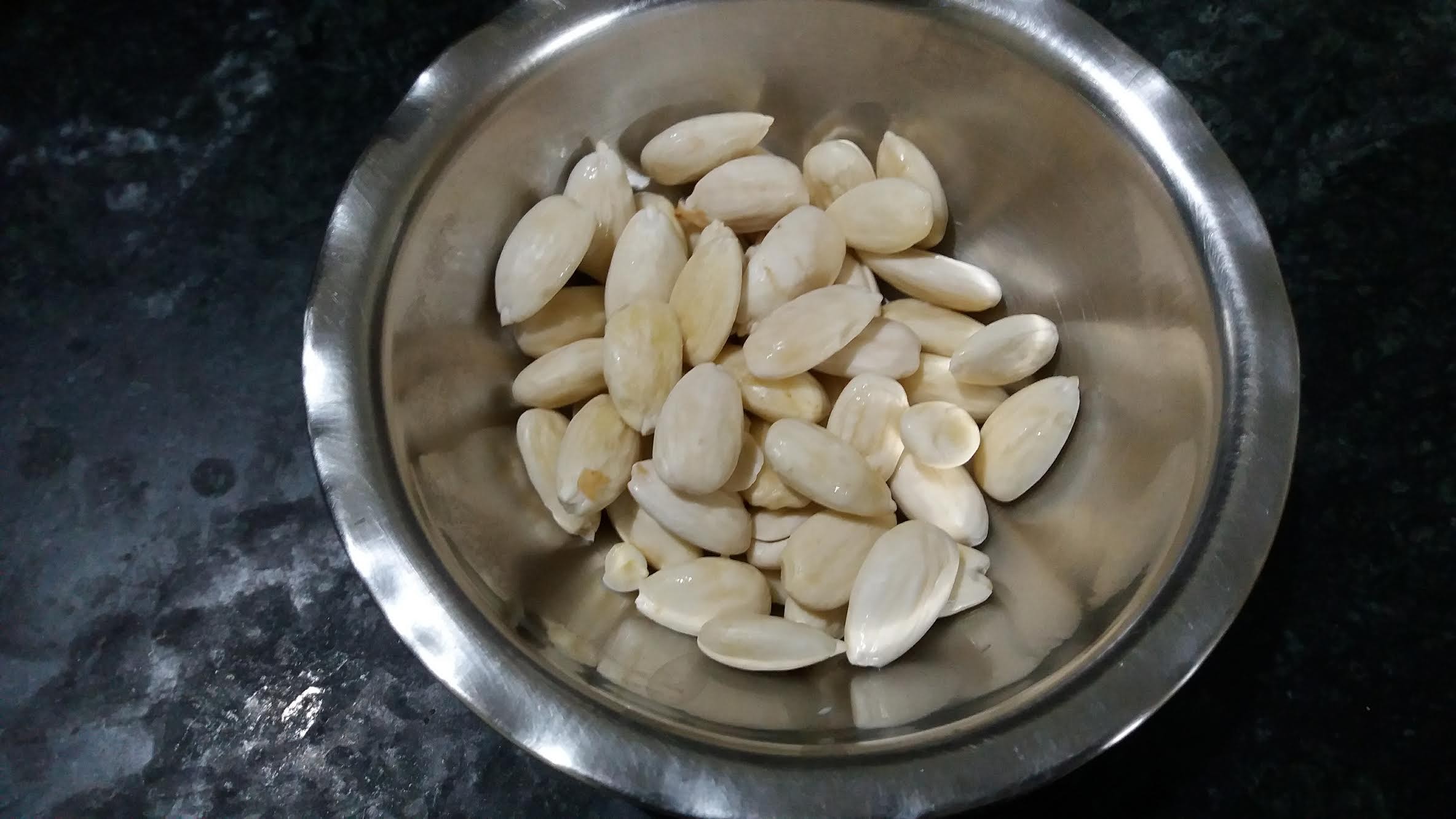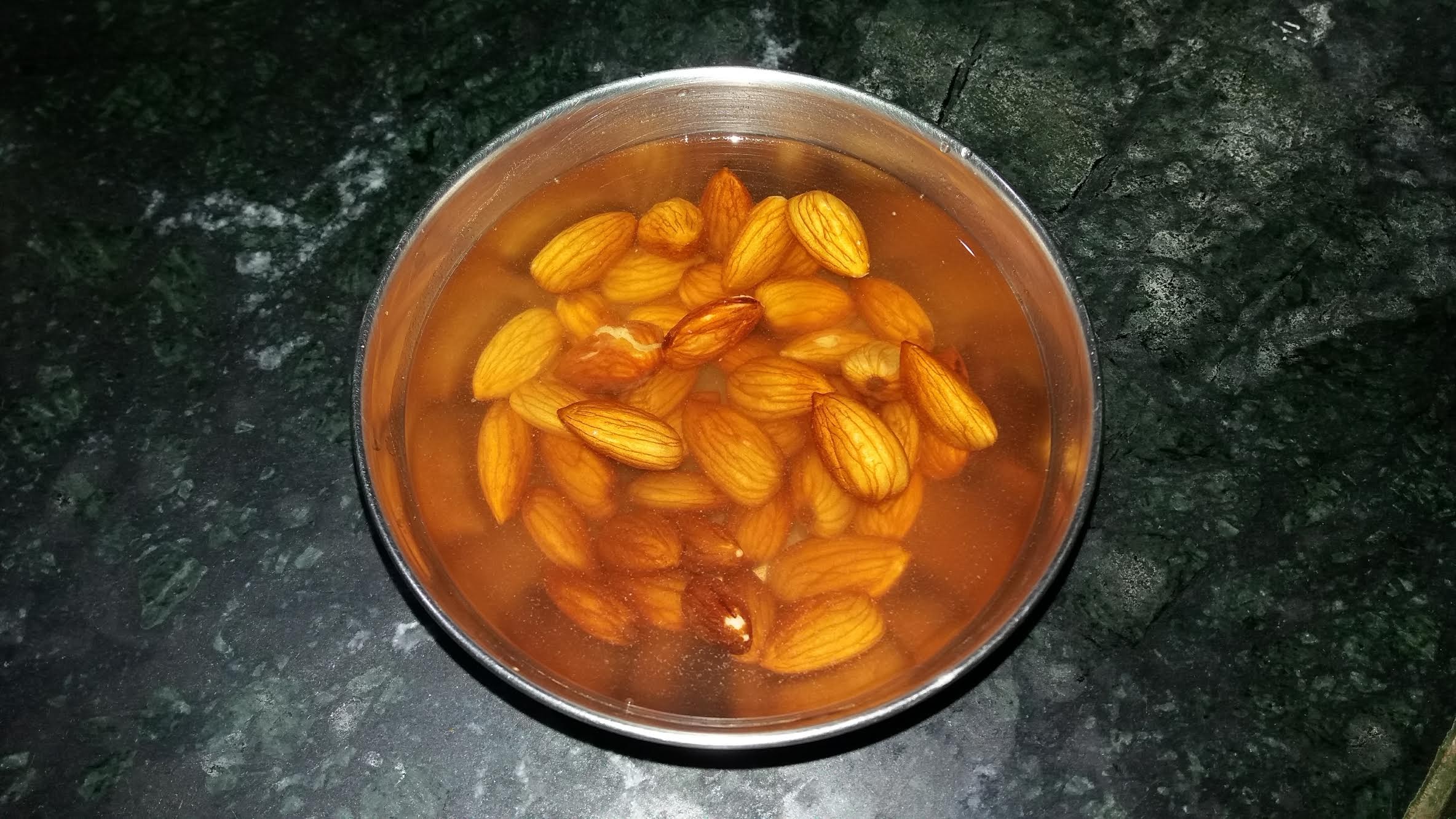 It all starts with soaking almonds/ badam for half an hour in warm water
