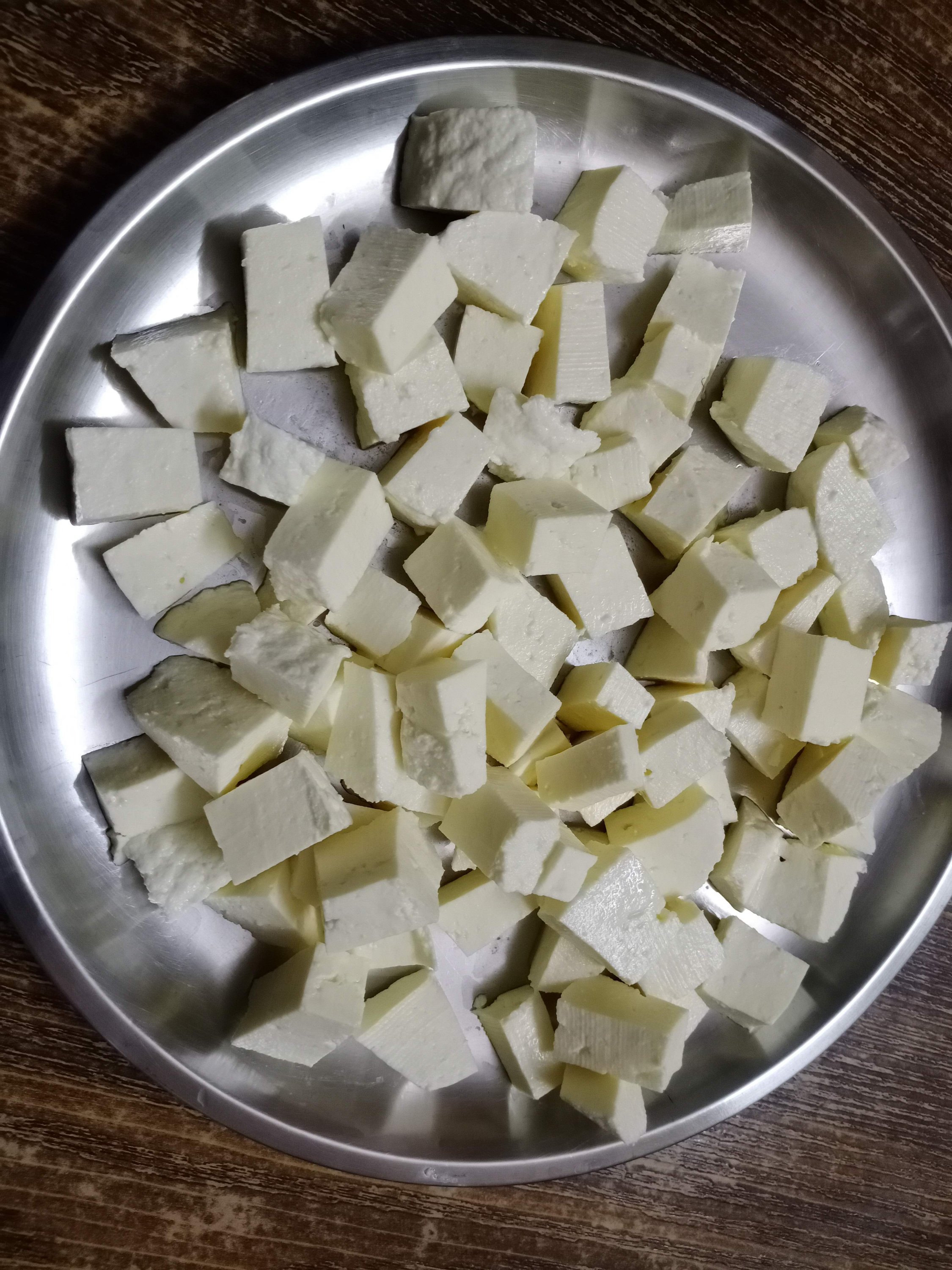 - Meanwhile cut paneer into cubes, if it’s store bought thaw it in warm water and use. This makes paneer soft, if it’s a bit hard