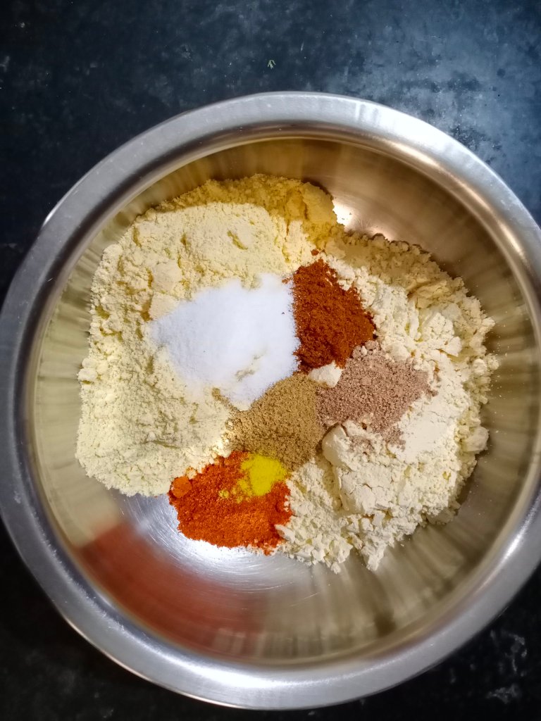 - Take a bowl mix all the given masala,salt and flour
