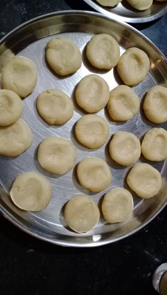 • Now roll the dough into lemon size and press in the middle to give it a shape