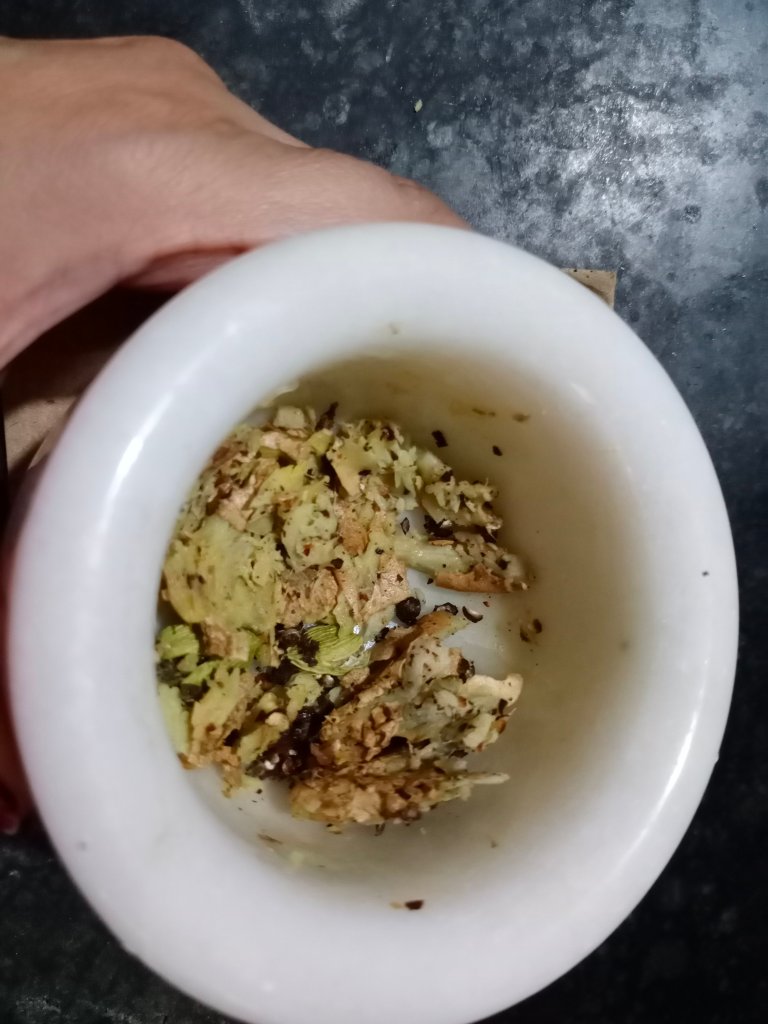 - Meanwhile grind a coarse powder of lavang, elaichi, black pepper and ginger in mortar pestle