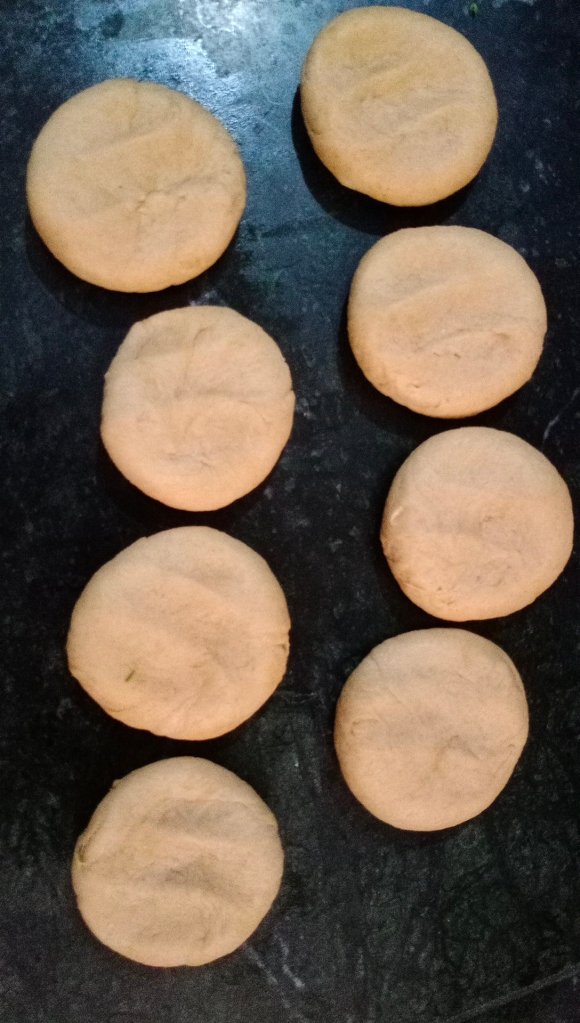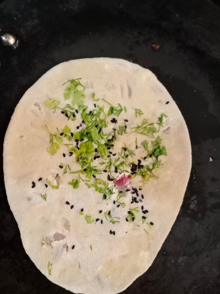 - Apply water on one side, sprinkle kalonji and chopped coriander leaves, press it with rolling pin