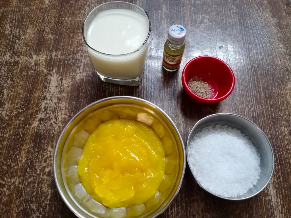 - Take a blender jar, pour curd or buttermilk, mango pulp, elaichi powder, sugar and mango essence