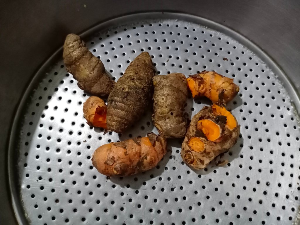 - After chopping haldi fine, heat a kadhai or wok with ghee and deep fry chopped haldi till golden brown