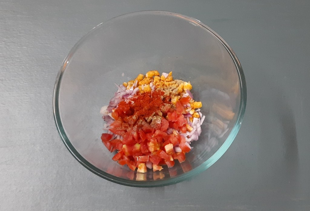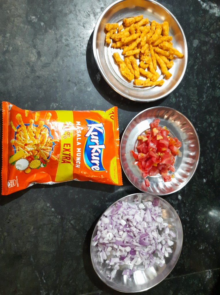 - Now in a mixing bowl add crushed kurkure, onion, tomato, red chili powder, chaat masala, Kala namak, coriander leaves, sev n tomato sauce.
