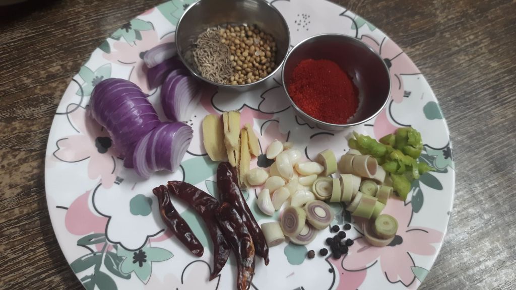 - In a mixer jar take all the given ingredients for curry paste and grind it fine, add water as required.