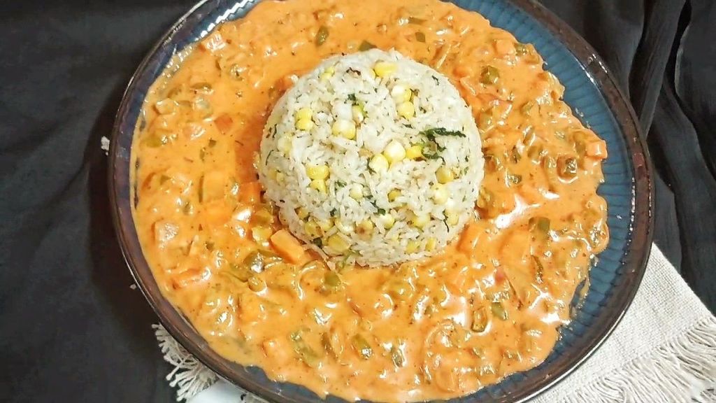 - Place the herded rice in a small bowl, place it upside-down on the serving plate and pour the corn gravy on the side. Remove the bowl gently