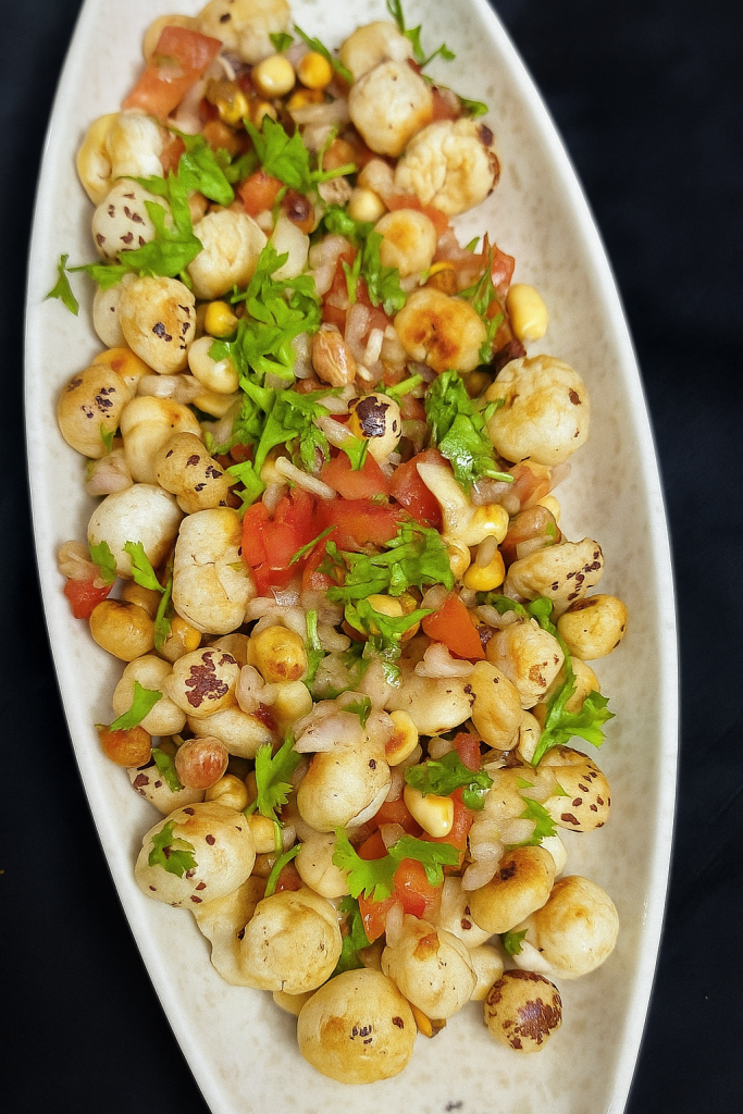 If you are looking for a light, crunchy and guilt -free snack, Makhana chaat (Foxnut Chaat) is the perfect recipe. IT’S quick nutritious and full of flavours.Foxnut(also known as makhana or lotus seeds) are roasted crisp in ghee and then tossed with fresh veggies, spices and crunchy peanuts for delicious snack.